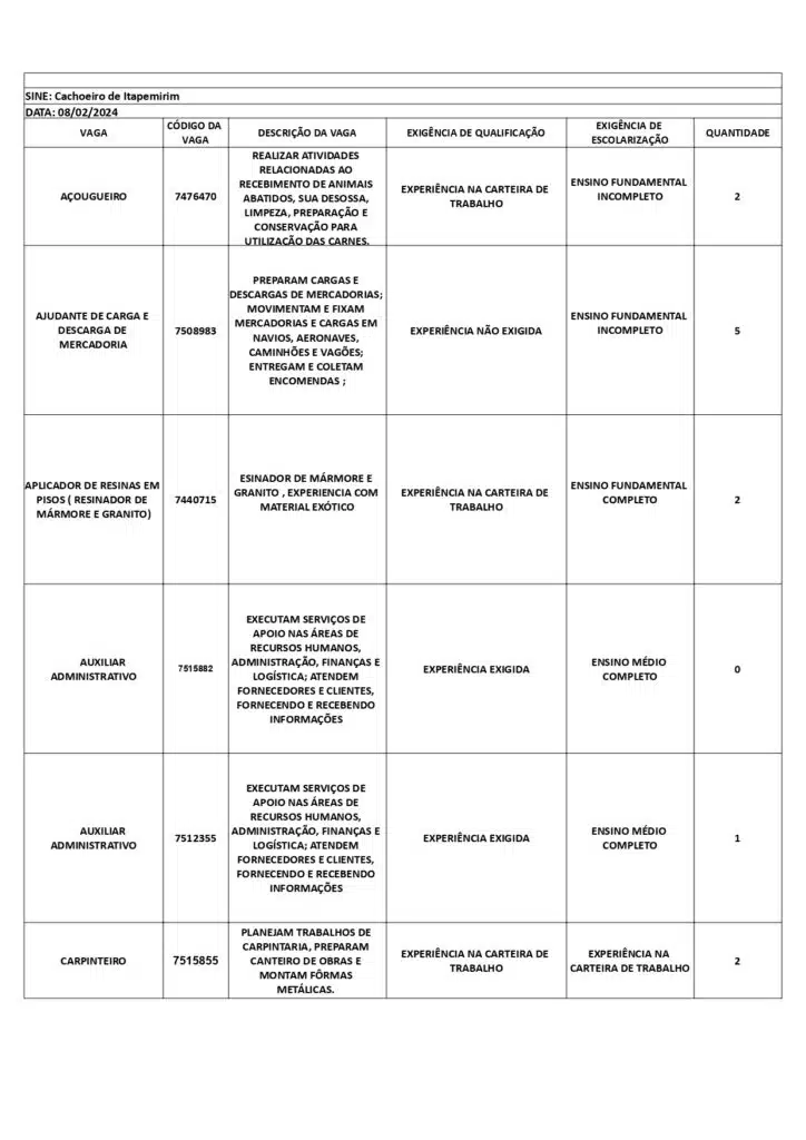 Receba as principais notícias no seu WhatsApp! clique aquiAs oportunidades de emprego são para diversos cargos e níveis de escolaridade e para cidades do Sul do ES. No entanto, é preciso fazer um cadastro no Sine Cachoeiro para concorrê-las.