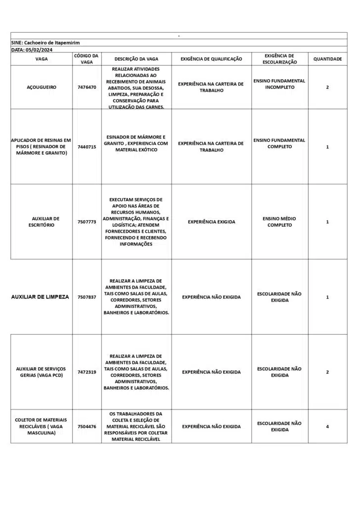 Receba as principais notícias no seu WhatsApp! clique aquiAs oportunidades de emprego são para diversos cargos e níveis de escolaridade e para cidades do Sul do ES. No entanto, é preciso fazer um cadastro no Sine Cachoeiro para concorrê-las.