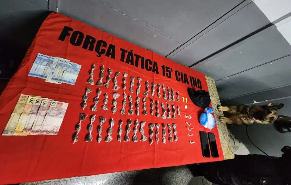 No local, a PM fez abordagens e averiguações, onde encontrou dois suspeitos com vasta quantidade de drogas. Com eles, a polícia apreendeu 121 buchas de maconha; 1 porção de crack; 2 pinos de cocaína; 22 pedras de crack; 1 papelote de cocaína; 2 celulares; 1 pochete preta; material de endola e R$ 114,00.