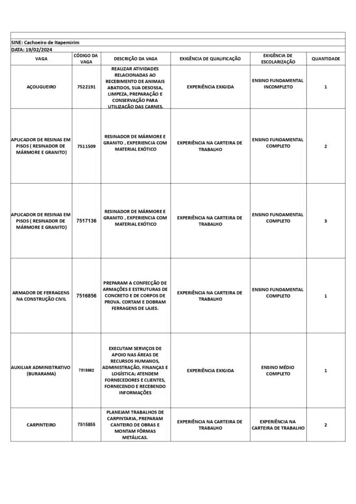 Receba as principais notícias no seu WhatsApp! clique aquiAs oportunidades de emprego são para diversos cargos e níveis de escolaridade e para cidades do Sul do ES. No entanto, é preciso fazer um cadastro no Sine Cachoeiro para concorrê-las.
