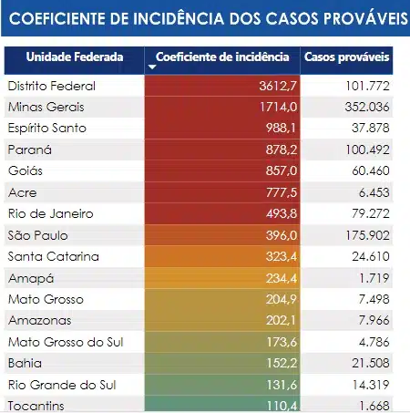 De acordo com dados do Ministério da Saúde, o Estado passou de incidência de 510 para 988,1 de casos prováveis por 100 mil habitantes, perdendo apenas para Minas Gerais, com 1714,0, e Distrito Federal, que registra coeficiente de incidência de 3612,7.