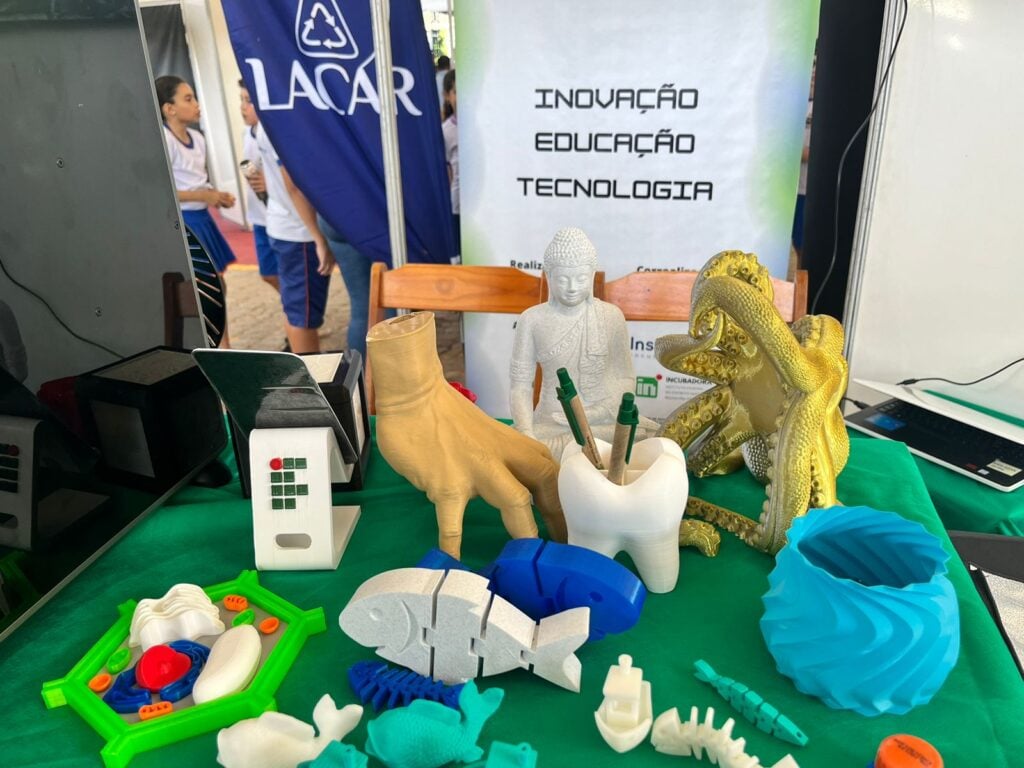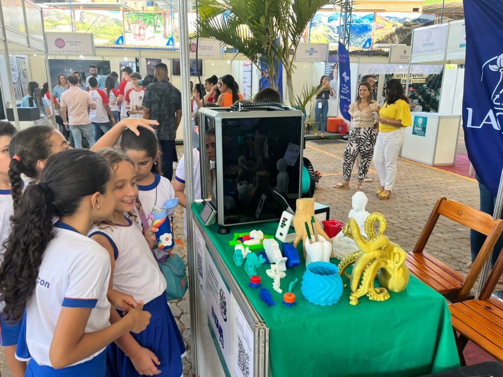 Já em outra tenda está exposta uma impressora 3D. A impressora não imprime papéis, como normalmente, mas sim objetos de um material parecido com plástico. O equipamento é apresentado por um bolsista do projeto Incubadora, apoiado pelo Instituto Federal de Venda Nova (IFES).