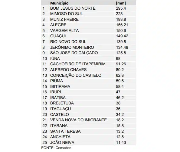 Bom Jesus do Norte, no extremo Sul capixaba, recebeu 295.4 mm de chuva nas últimas 24 horas. O município de Mimoso do Sul recebeu 228 mm de volume de chuva