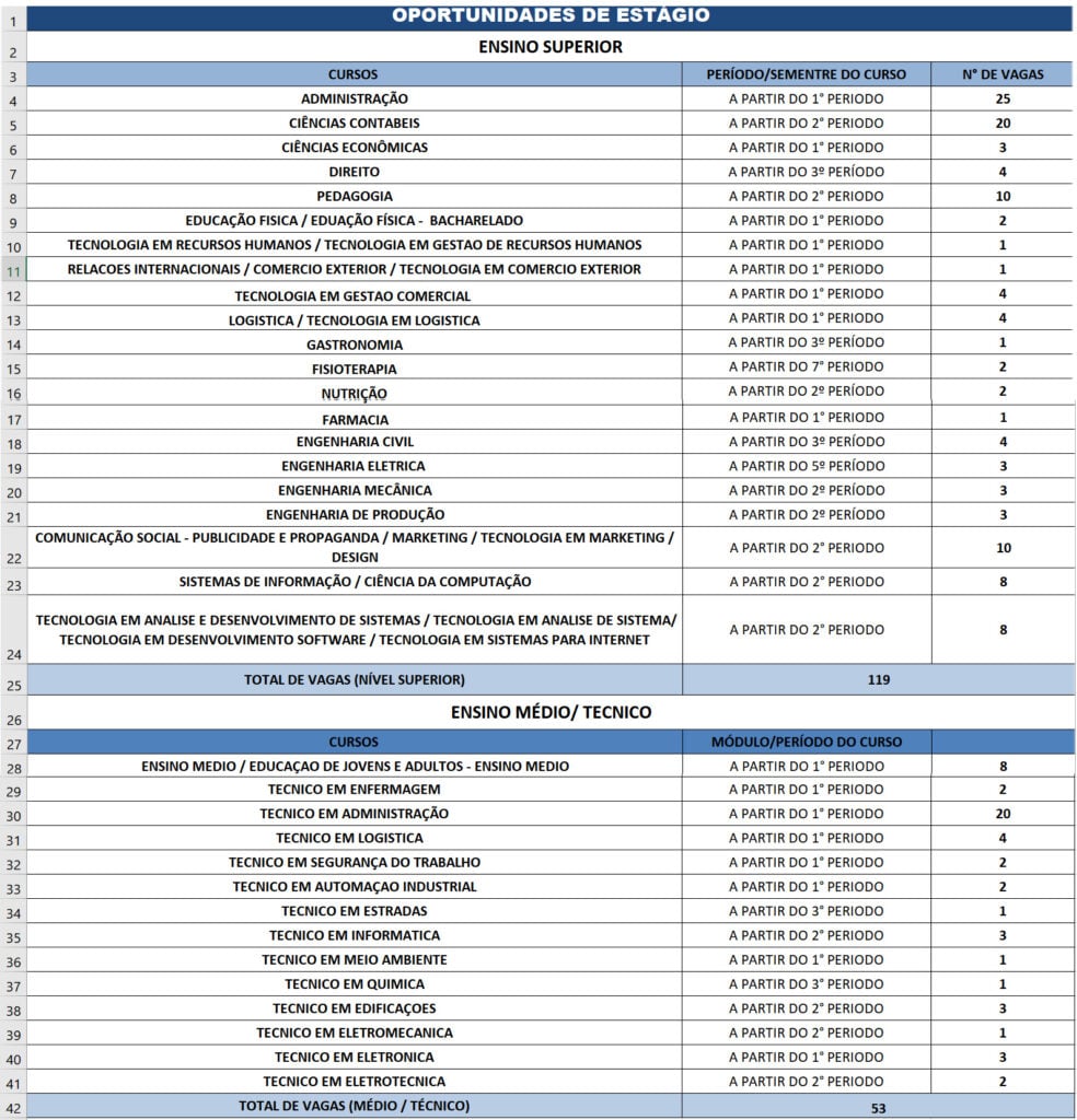 O Centro de Integração Empresa Escola do Espírito Santo (CIEE-ES) está com 172 vagas de estágio abertas para estudantes matriculados no ensino médio e superior. São 119 para início imediato em áreas de nível superior e 53 vagas para nível médio/técnico. Para se inscrever, os interessados podem acessar o Portal do CIEE-ES em www.ciee-es.org.br .