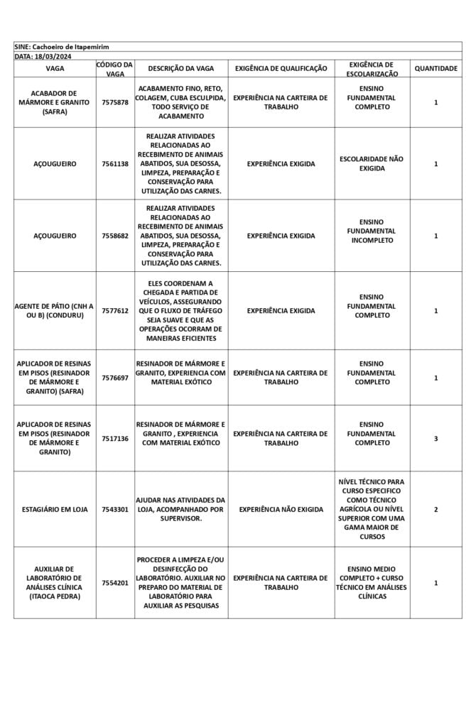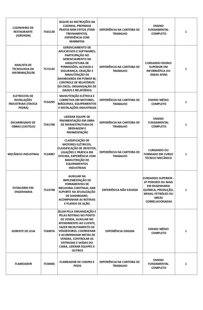 Receba as principais notícias no seu WhatsApp! clique aquiAs oportunidades de emprego são para diversos cargos e níveis de escolaridade e para cidades do Sul do ES. No entanto, é preciso fazer um cadastro no Sine Cachoeiro para concorrê-las.