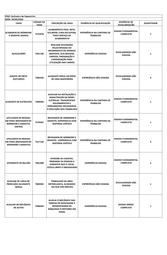 Receba as principais notícias no seu WhatsApp! clique aquiAs oportunidades de emprego são para diversos cargos e níveis de escolaridade e para cidades do Sul do ES. No entanto, é preciso fazer um cadastro no Sine Cachoeiro para concorrê-las.