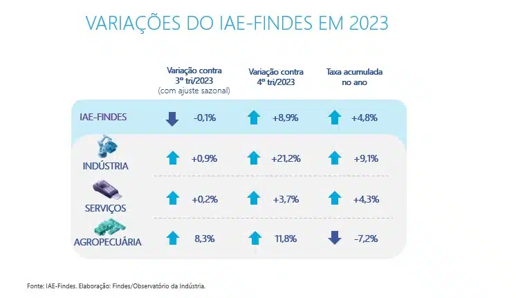 Aliás, além da indústria extrativa, a atividade de energia e saneamento e o segmento da construção registraram bons números em 2023, crescendo 7,7% e 0,9%, respectivamente.