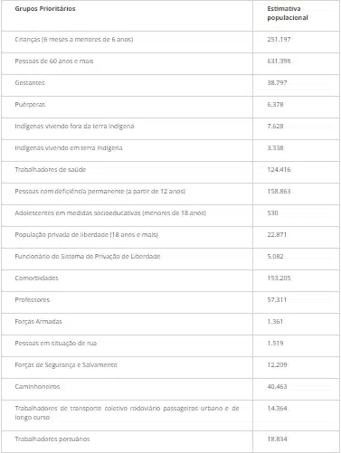Para os demais grupos é monitorado o número de doses aplicadas. Contudo, ao todo, somando os grupos com meta (653.272 doses) e demais grupos prioritários (651.914 doses), o Estado totalizou 1.305.186 doses aplicadas em toda a campanha.