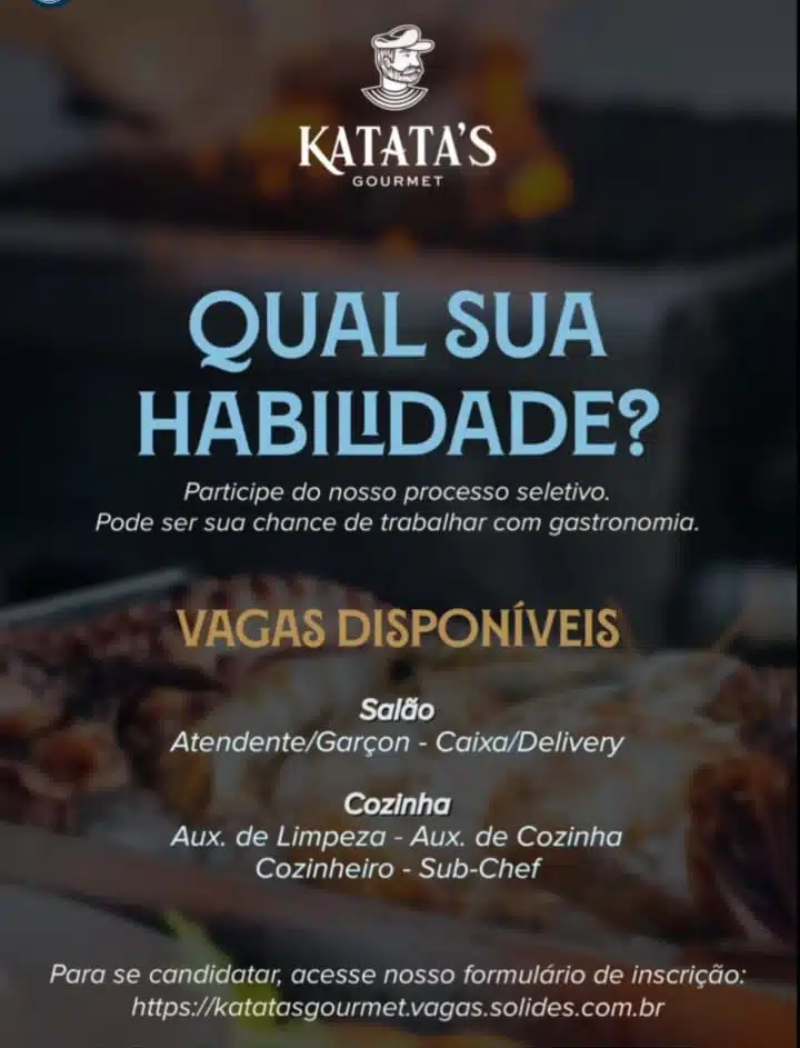 Os interessados devem cadastrar o currículo pelo site: https://katatasgourmet.vagas.solides.com.br/