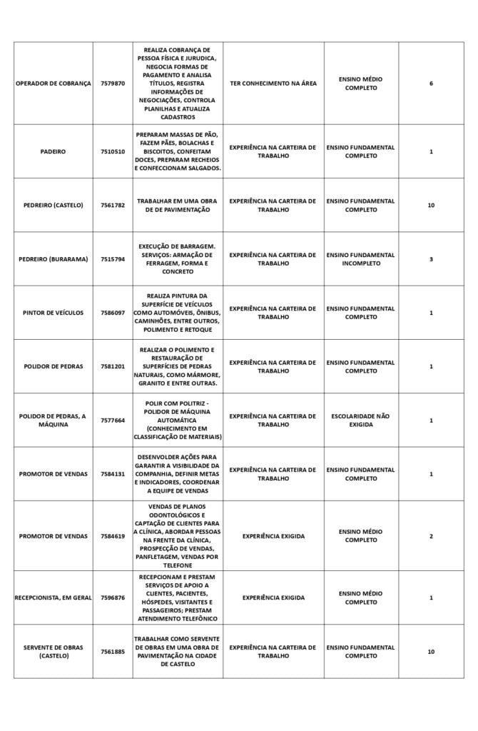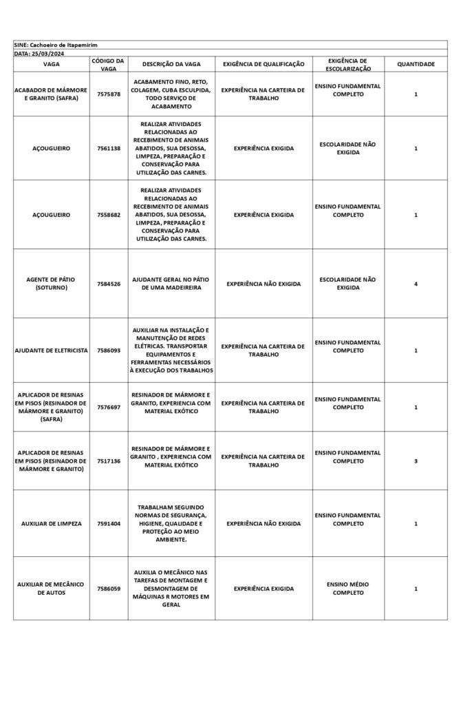 Receba as principais notícias no seu WhatsApp! clique aquiAs oportunidades de emprego são para diversos cargos e níveis de escolaridade e para cidades do Sul do ES. No entanto, é preciso fazer um cadastro no Sine Cachoeiro para concorrê-las.