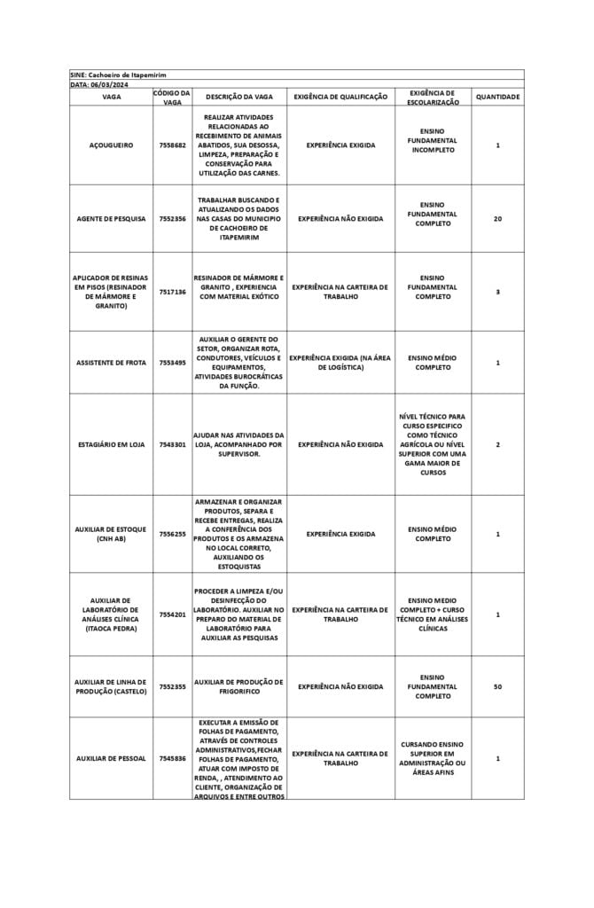 Receba as principais notícias no seu WhatsApp! clique aquiAs oportunidades de emprego são para diversos cargos e níveis de escolaridade e para cidades do Sul do ES. No entanto, é preciso fazer um cadastro no Sine Cachoeiro para concorrê-las.