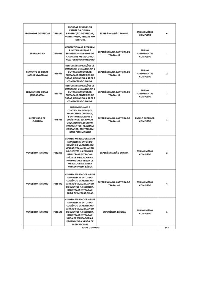 Sine Cachoeiro oferta 143 vagas de emprego nesta quarta-feira (6)