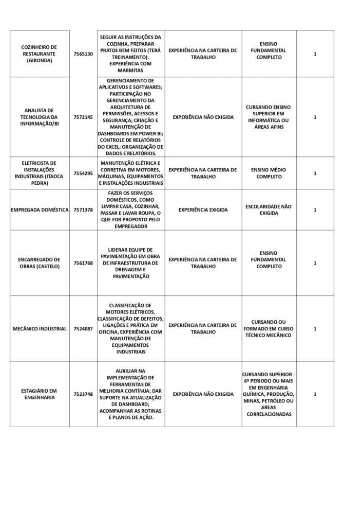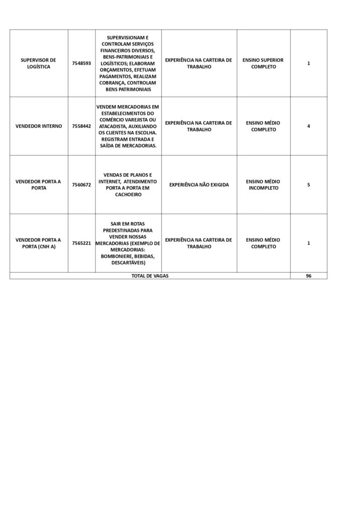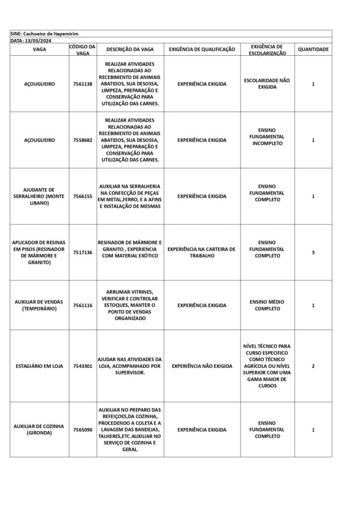 Receba as principais notícias no seu WhatsApp! clique aquiAs oportunidades de emprego são para diversos cargos e níveis de escolaridade e para cidades do Sul do ES. No entanto, é preciso fazer um cadastro no Sine Cachoeiro para concorrê-las.
