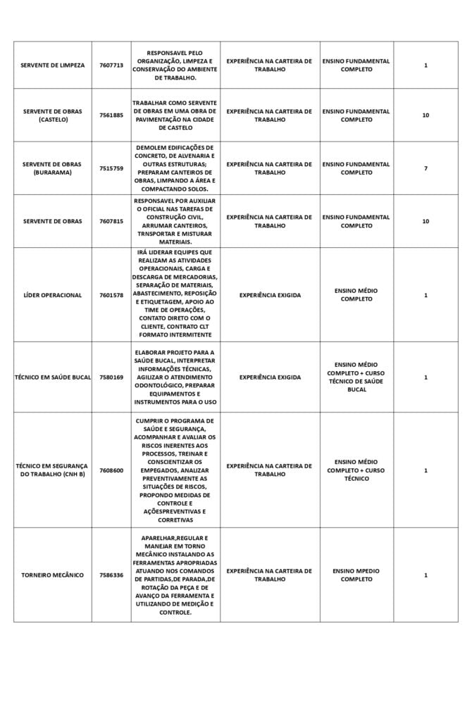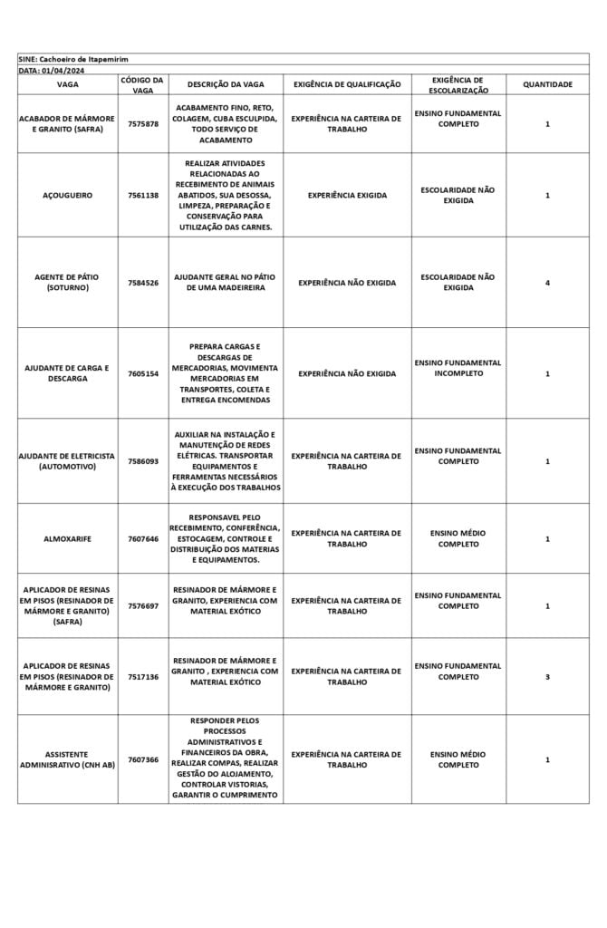As oportunidades de emprego são para diversos cargos e níveis de escolaridade e para cidades do Sul do ES. No entanto, é preciso fazer um cadastro no Sine Cachoeiro para concorrê-las.