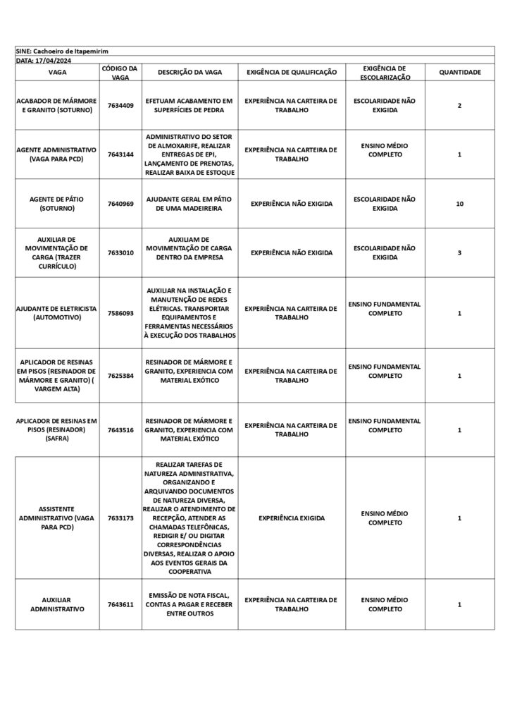 Receba as principais notícias no seu WhatsApp! clique aquiAs oportunidades de emprego são para diversos cargos e níveis de escolaridade e para cidades do Sul do ES. No entanto, é preciso fazer um cadastro no Sine Cachoeiro para concorrê-las.
