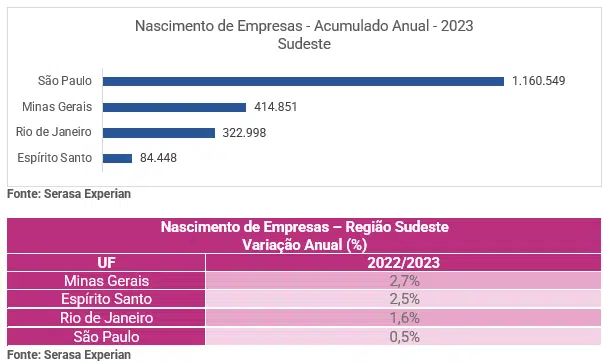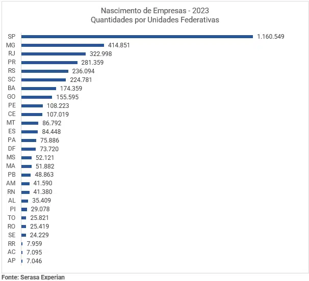 Três dos quatro estados do Sudeste lideraram o ranking de abertura de empresas em 2023: São Paulo (1.160.549), Minas Gerais (414.851) e Rio de Janeiro. Confira os dados de todas as Unidades Federativas (UFs):