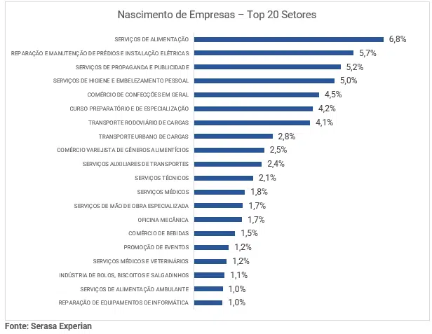 Na visão nacional, o fechamento anual do Indicador de Nascimento de Empresas da Serasa Experian revelou que, em 2023, foram criados 3,9 milhões de novos empreendimentos no Brasil, um crescimento de 1,0% em relação a 2022. “Serviços de Alimentação” foi o segmento responsável pela maior abertura no ano (6,8%). Veja, no gráfico a seguir, o ranking dos top 20 setores que mais criaram negócios no período:
