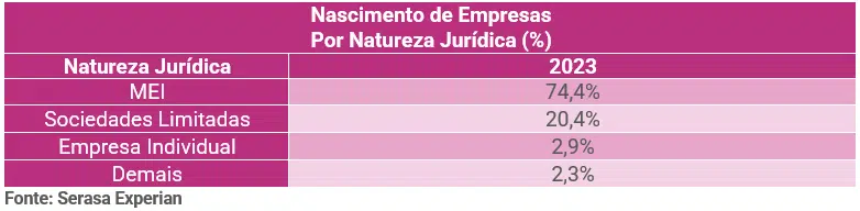 Na hora de formalizar um negócio em 2023, a categoria de Microempreendedores Individuais (MEIs) foi a principal escolha dos empreendedores, com “Sociedades Limitadas” logo depois (20,4%). Veja, na tabela abaixo, o detalhamento por Natureza Jurídica: