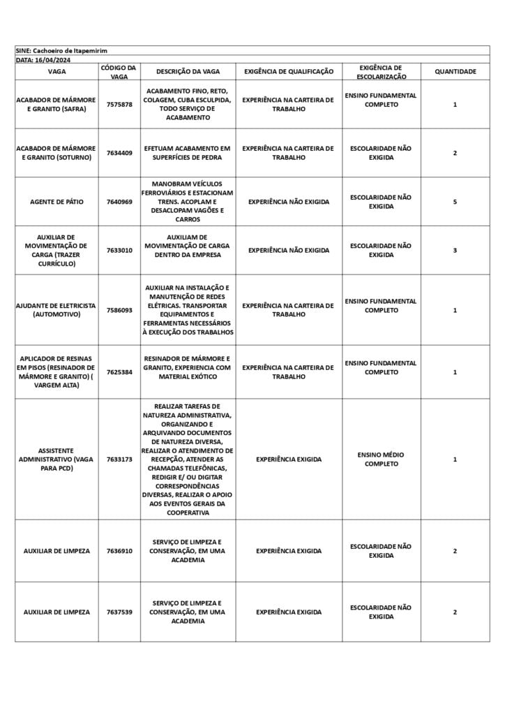 Receba as principais notícias no seu WhatsApp! clique aquiAs oportunidades de emprego são para diversos cargos e níveis de escolaridade e para cidades do Sul do ES. No entanto, é preciso fazer um cadastro no Sine Cachoeiro para concorrê-las.