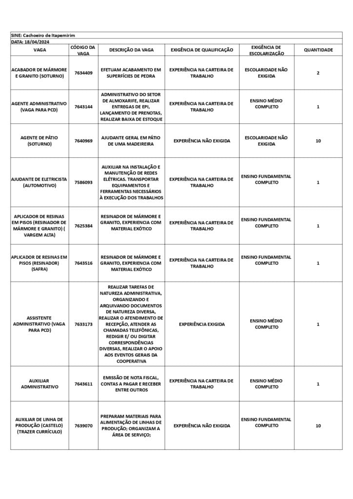 Receba as principais notícias no seu WhatsApp! clique aquiAs oportunidades de emprego são para diversos cargos e níveis de escolaridade e para cidades do Sul do ES. No entanto, é preciso fazer um cadastro no Sine Cachoeiro para concorrê-las.
