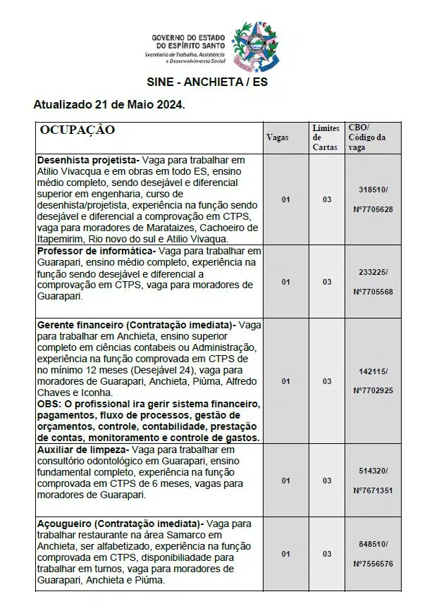Ainda segundo o Sine Anchieta, as vagas de empregos poderão sofrer alteração sem aviso prévio. Além disso, para cada oportunidade, há um limite de encaminhamento especificado pela empresa.