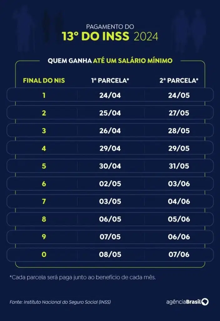Receba as principais notícias no seu WhatsApp! clique aquiO pagamento do décimo terceiro a quem ganha um salário mínimo começou no último dia 24 e também vai até o dia 8. Até o fim desta semana, mais de 33,6 milhões de segurados receberão a primeira parcela, ao somar os que ganham o benefício mínimo e os que recebem acima dele.
