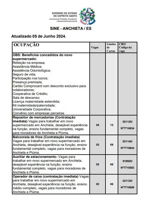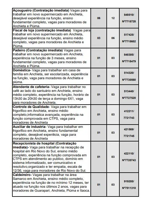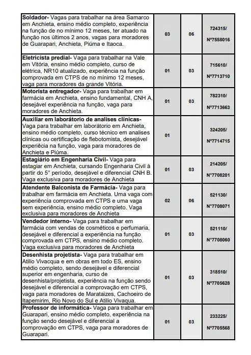 Ainda segundo o Sine Anchieta, as vagas de empregos poderão sofrer alteração sem aviso prévio. Além disso, para cada oportunidade, há um limite de encaminhamento especificado pela empresa.