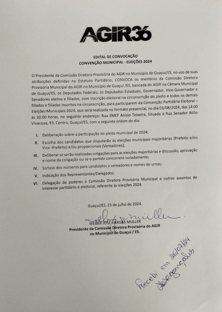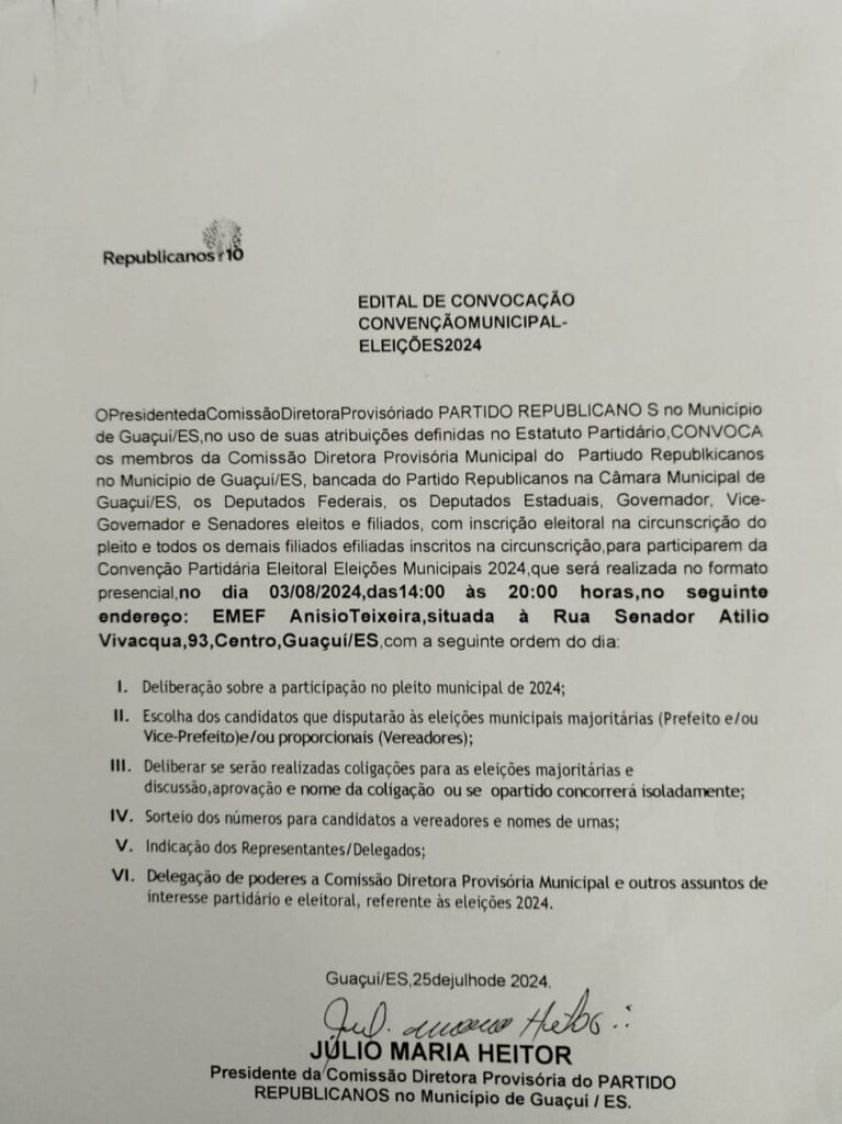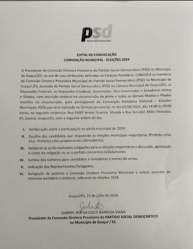 A convenção dos partidos Progressistas, Republicanos, AGIR e PSD irá ser realizada no sábado, dia 3 de agosto, das 14 às 20 horas, na Escola Anísio Teixeira, localizada na rua Senador Atílio Vivacqua, no centro.
