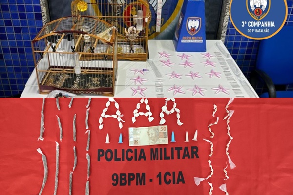 Já em Castelo, durante patrulhamento, os militares apreenderam 154 pinos de cocaína, uma bucha de haxixe e quatro sacolas com a mesma droga. Também foram encontrados R$ 1.600 em espécie, embalagens para endolação e dois pássaros silvestres em gaiolas sem anilhas.
