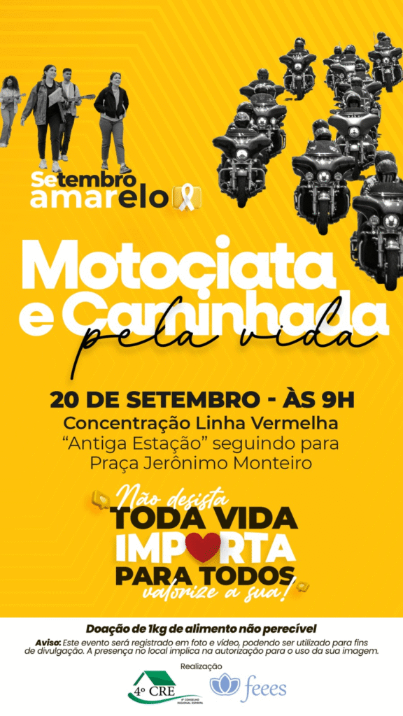 O Conselho Regional Espírita (CRE) realiza, no próximo sábado (20), uma caminhada e motociata abertas à população. A programação especial é realizada em apoio ao Setembro Amarelo, mês dedicado à prevenção ao suicídio e à valorização da vida.