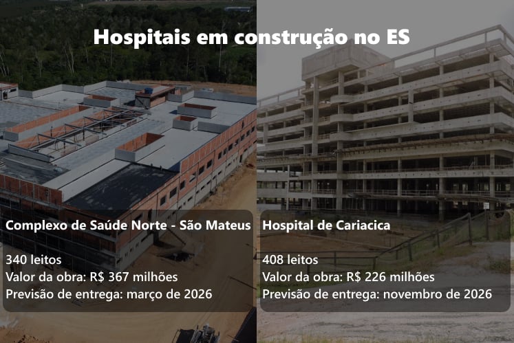 O gestor deu destaque a duas grandes obras em fase de execução. Uma delas é o Complexo de Saúde Norte, que está sendo construído em São Mateus, e contará com 340 leitos. A obra orçada em R$ 367 milhões já teve 69% de sua execução física concluída. A previsão de conclusão é para março de 2026. Já o Hospital de Cariacica contará com 408 leitos. Dos R$ 226 milhões que serão investidos, R$ 109 milhões já foram executados. A conclusão está prevista para novembro de 2026.