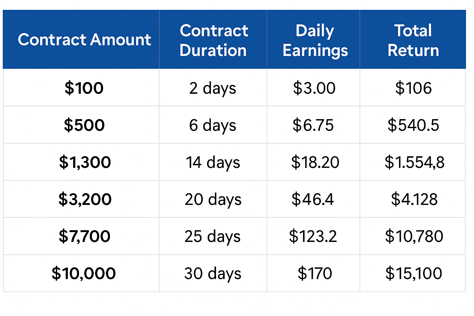 Após a compra de um contrato, o sistema ativa automaticamente o poder de computação e inicia a liquidação diária dos lucros.