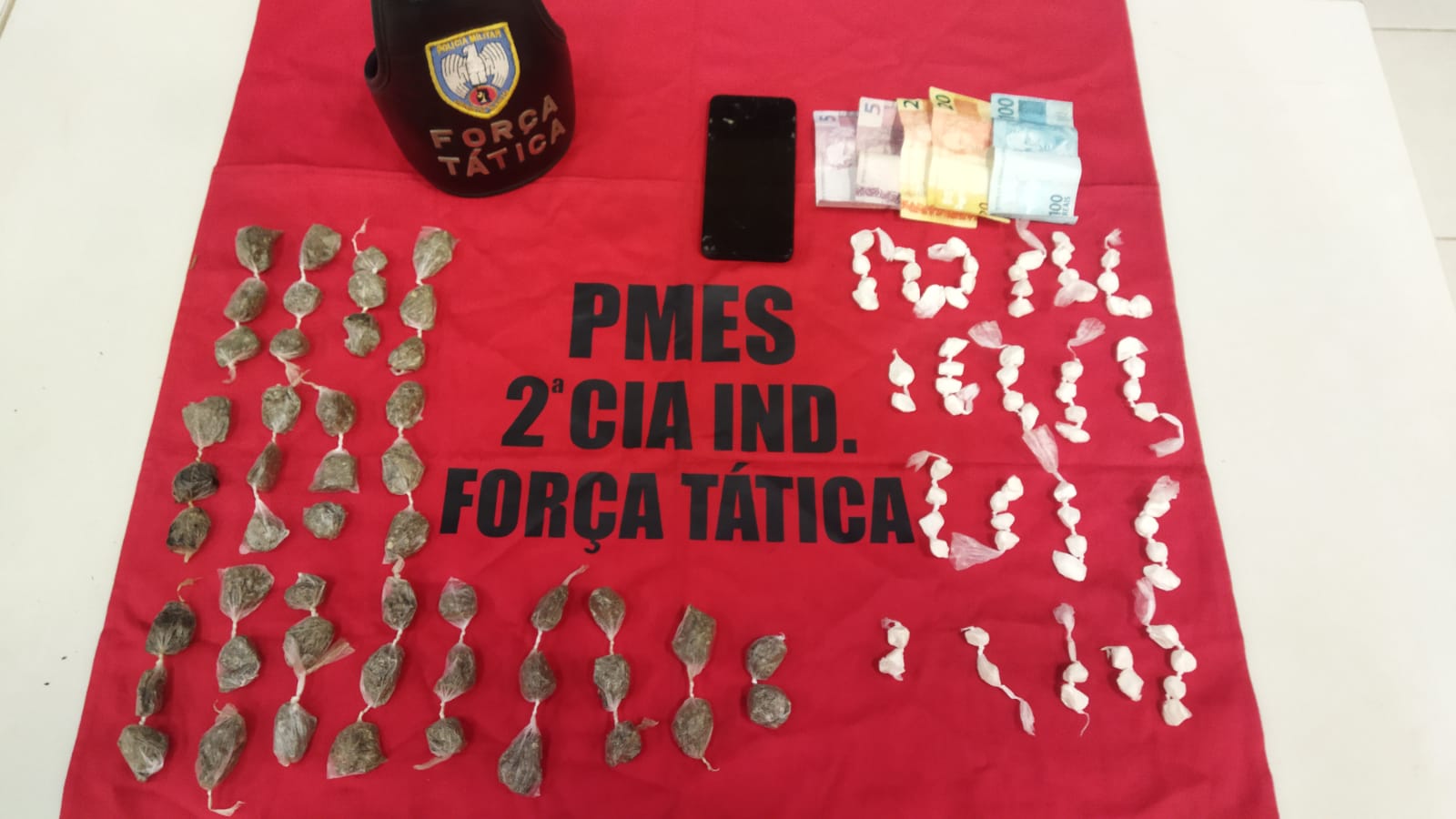 No local indicado, a polícia encontrou 49 buchas de maconha e 70 papelotes de cocaína, todos prontos para venda. Além das drogas, um celular foi apreendido para investigação.
