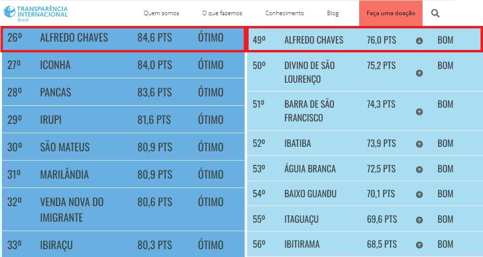 O município caiu da 26ª posição para a 49ª no Ranking Capixaba de Transparência e Governança Pública, segundo o portal transparenciainternacional.org.br. A mensuração ainda aponta que a avaliação também caiu de ótima para bom.