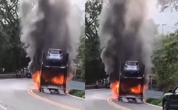 Um vídeo, que circula nas redes sociais, mostra o veículo em chamas no meio da pista. O fogo se concentra na parte inferior do caminhão, atingindo principalmente a carroceria que transporta automóveis. As chamas estão intensas e produzem uma densa coluna de fumaça preta.