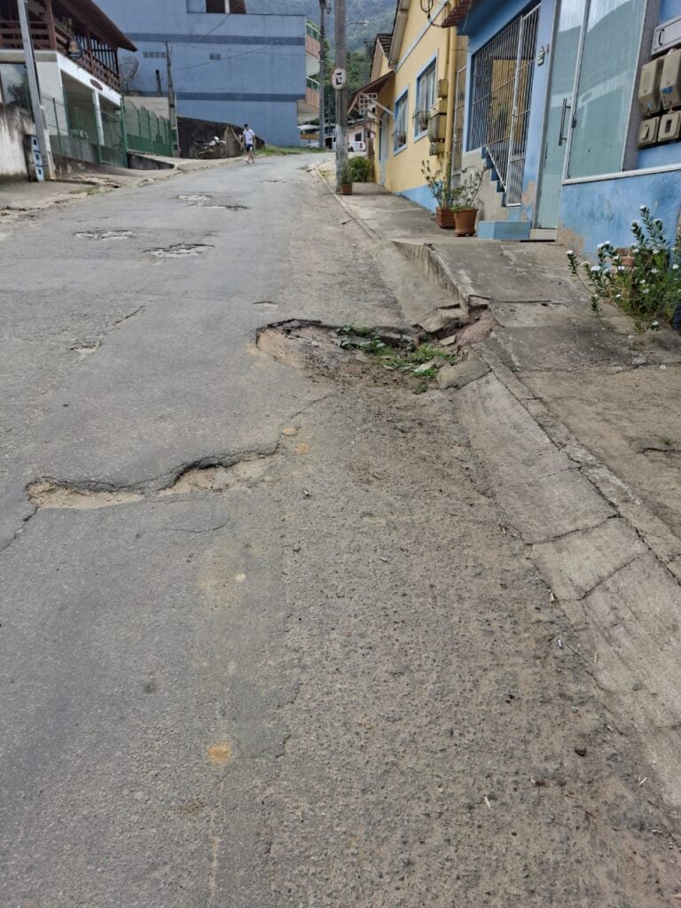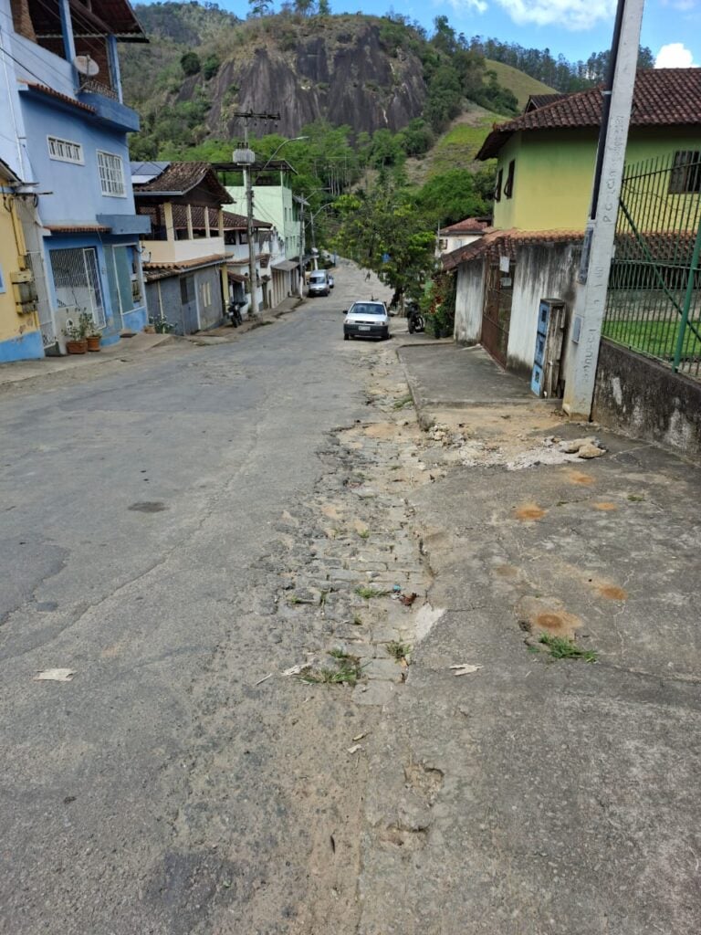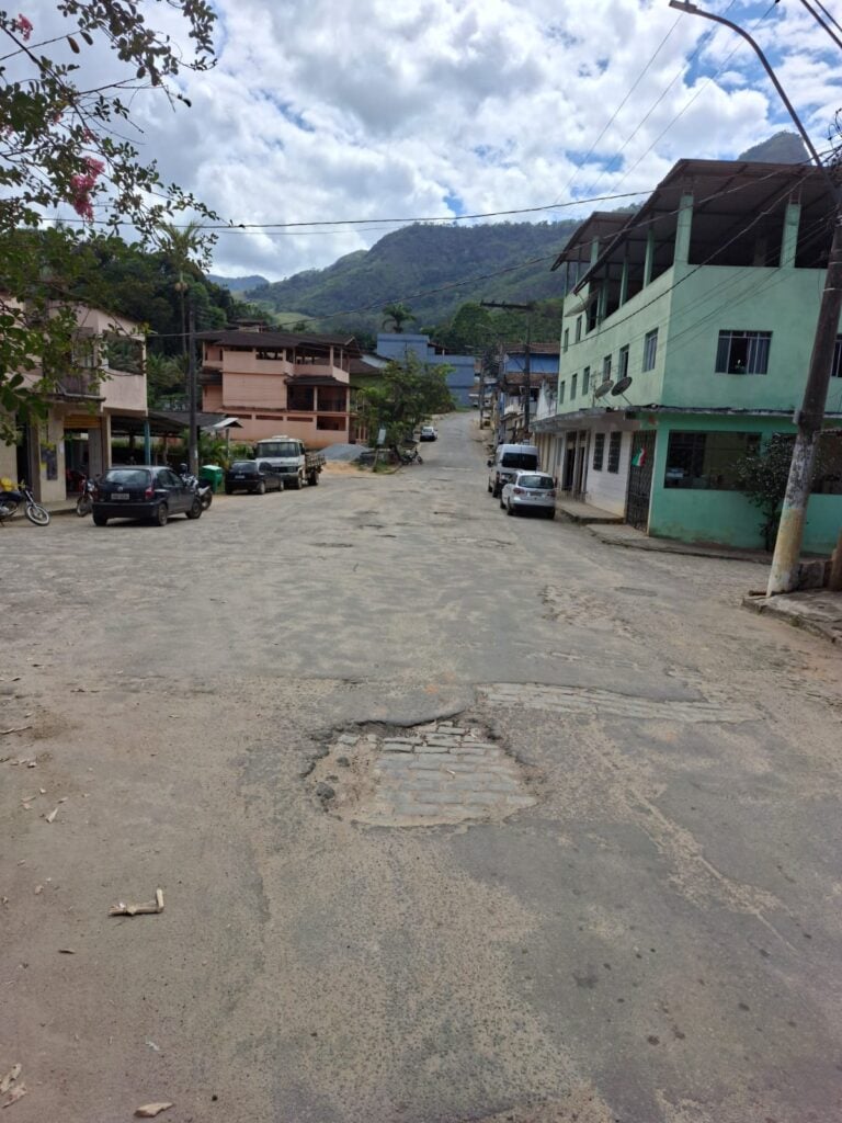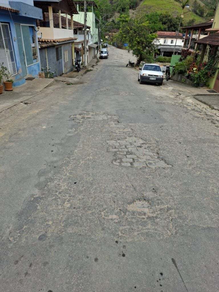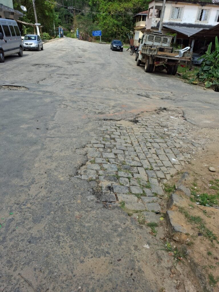 Em outra extensão da malha viária, o asfalto está bastante deteriorado, revelando até o antigo calçamento de pedras. O desgaste é evidente, com rachaduras e trechos afundados.