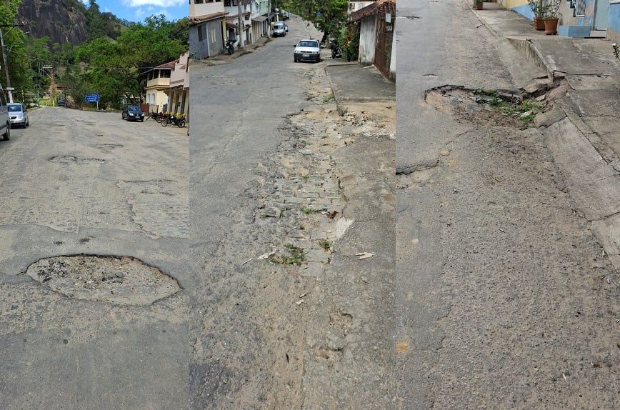 Em outra extensão da malha viária, o asfalto está bastante deteriorado, revelando até o antigo calçamento de pedras. O desgaste é evidente, com rachaduras e trechos afundados.