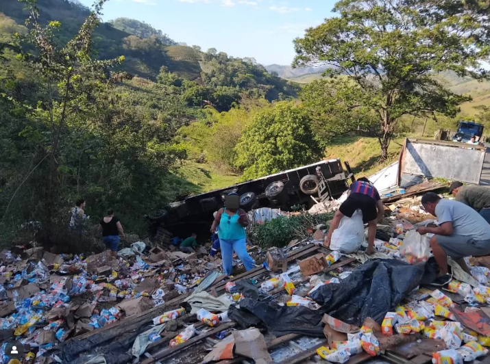 Caminhão carregado de leite tomba na serra entre Venda Nova e Castelo