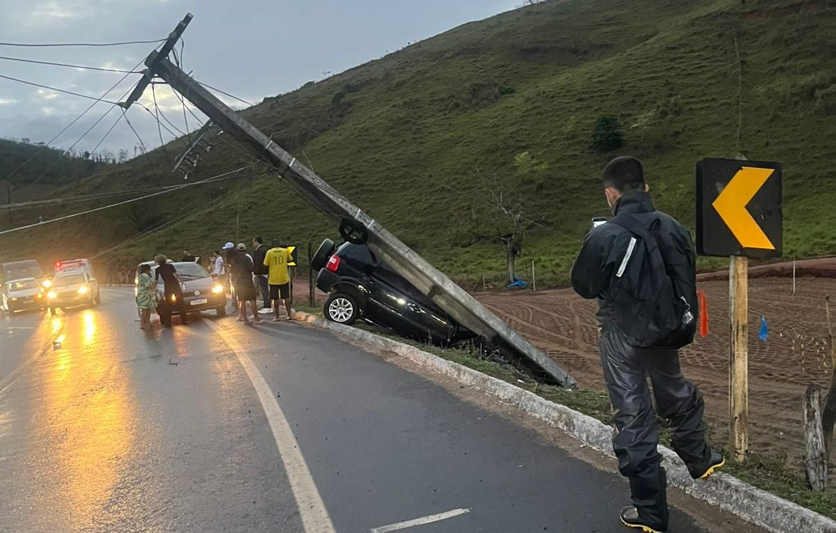 Carro sai da pista e colide com poste durante chuva em Cachoeiro