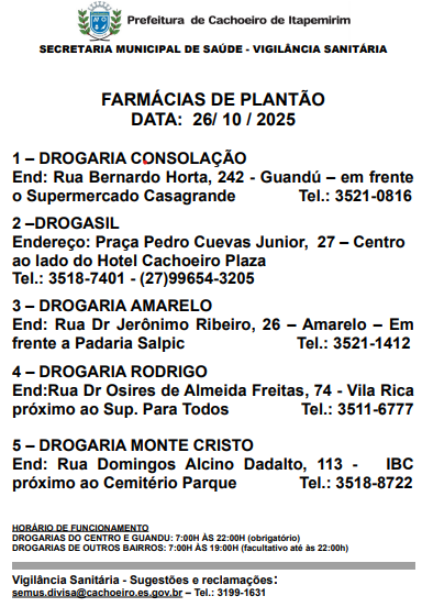 Moradores de Cachoeiro de Itapemirim contam com o atendimento das farmácias de plantão neste domingo (26), garantindo o acesso a medicamentos e produtos essenciais durante todo o dia. As unidades permanecem abertas em sistema de revezamento, tanto no Centro quanto em bairros da cidade. Confira.