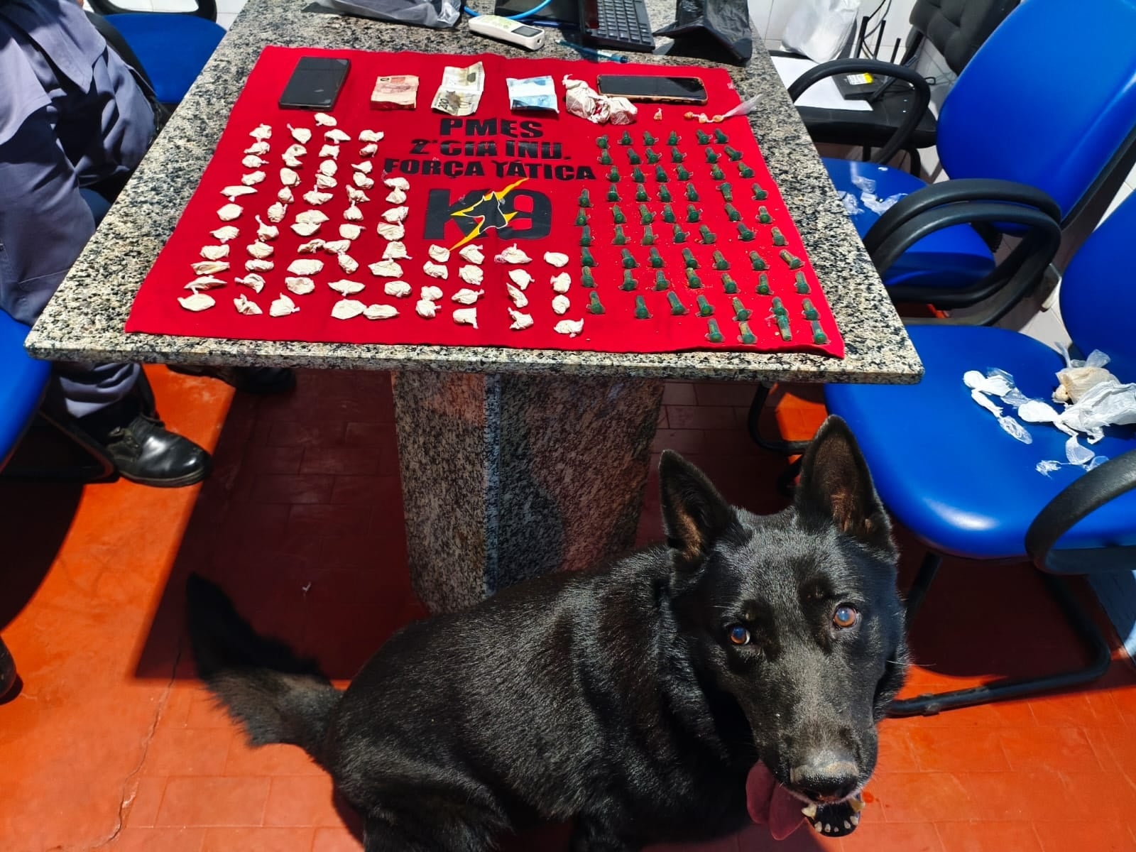 Durante as buscas, o animal ainda indicou outro ponto, sob um tanque velho, onde foram encontradas duas pedras grandes de crack, pesando cerca de 25 gramas cada. Próximo a um veículo, foram localizados mais 10 pinos de crack, todos prontos para comercialização.