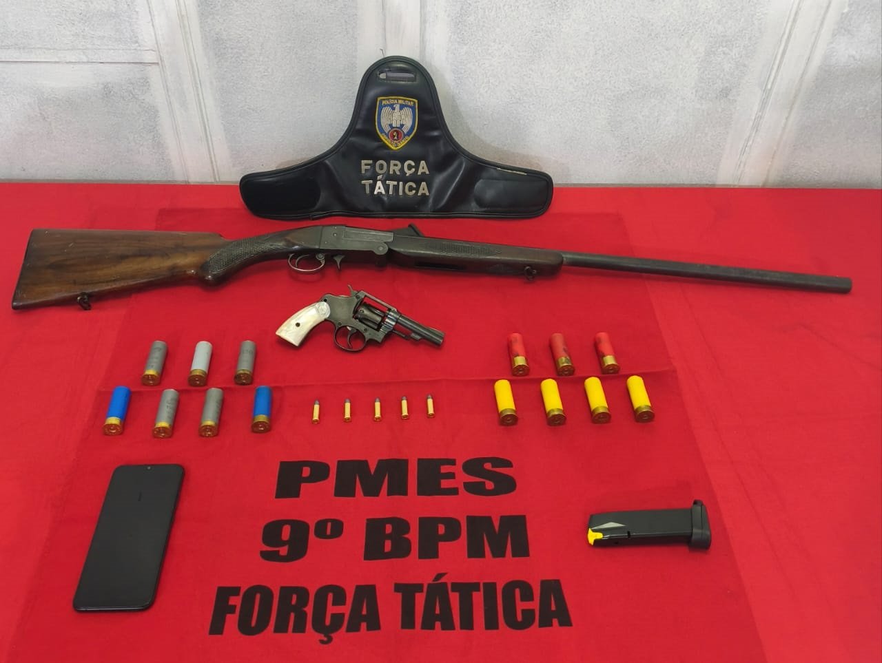 A Polícia Militar apreendeu duas armas de fogo e diversas munições durante uma ação no bairro Fé e Raça, em Cachoeiro de Itapemirim, nesta terça-feira (7). A ocorrência foi registrada por equipes da Força Tática do 9º Batalhão.