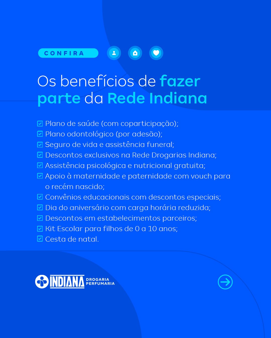 Além de oferecer oportunidades de crescimento, a Farmácia Indiana é reconhecida por seu ambiente de trabalho colaborativo e pelo investimento em qualificação profissional dos colaboradores, com planos de carreira e treinamentos constantes.