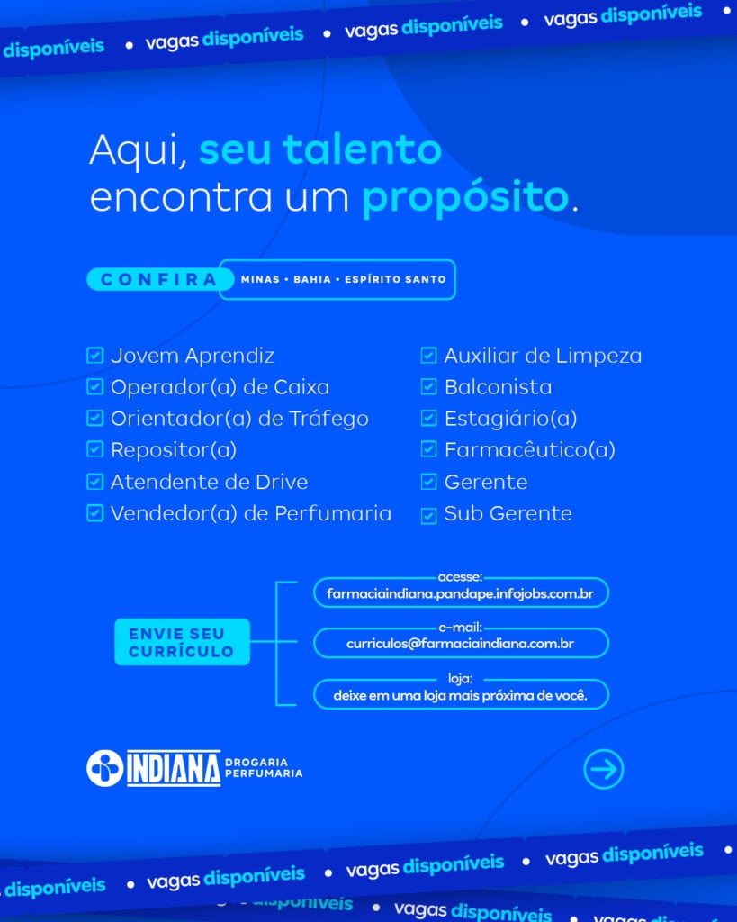 A Farmácia Indiana está com diversas oportunidades de trabalho abertas em Itapemirim e Cachoeiro.