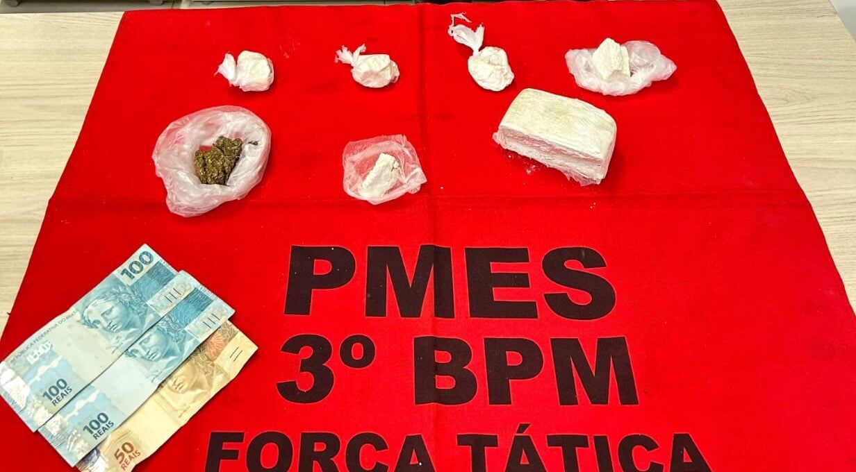 Durante a abordagem, a busca pessoal identificou 13,3 gramas de cocaína escondidas na boca do suspeito, além de 250 reais em espécie. Na sequência, os policiais localizaram a sacola que ele havia descartado, onde estava o restante da droga. Ao todo, foram recolhidos um tablete de cocaína pesando 261,25 gramas, cinco pedras grandes totalizando 131 gramas, além de uma porção média de maconha. O dinheiro apreendido também foi encaminhado como parte do material utilizado no crime.