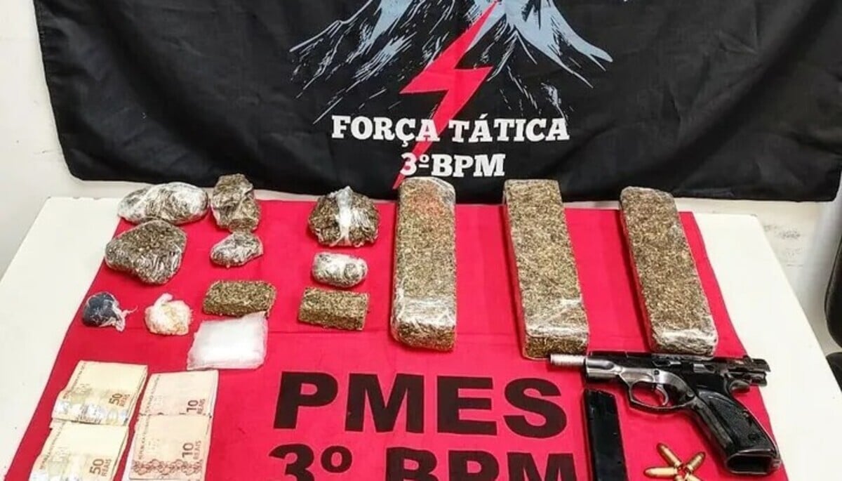 Na abordagem, os policiais encontraram R$ 289 em espécie, em notas trocadas e com odor característico de maconha. Durante buscas no imóvel, foram localizados uma pistola calibre 9mm, com carregador e 15 munições, além de grande quantidade de entorpecentes, totalizando aproximadamente 1,680 kg de maconha, além de porções de haxixe e crack. O material apreendido incluía três tabletes grandes e dois médios de maconha, seis porções grandes da mesma droga, uma bucha de haxixe pesando 20,96 gramas e uma porção média de crack com 21,79 gramas.