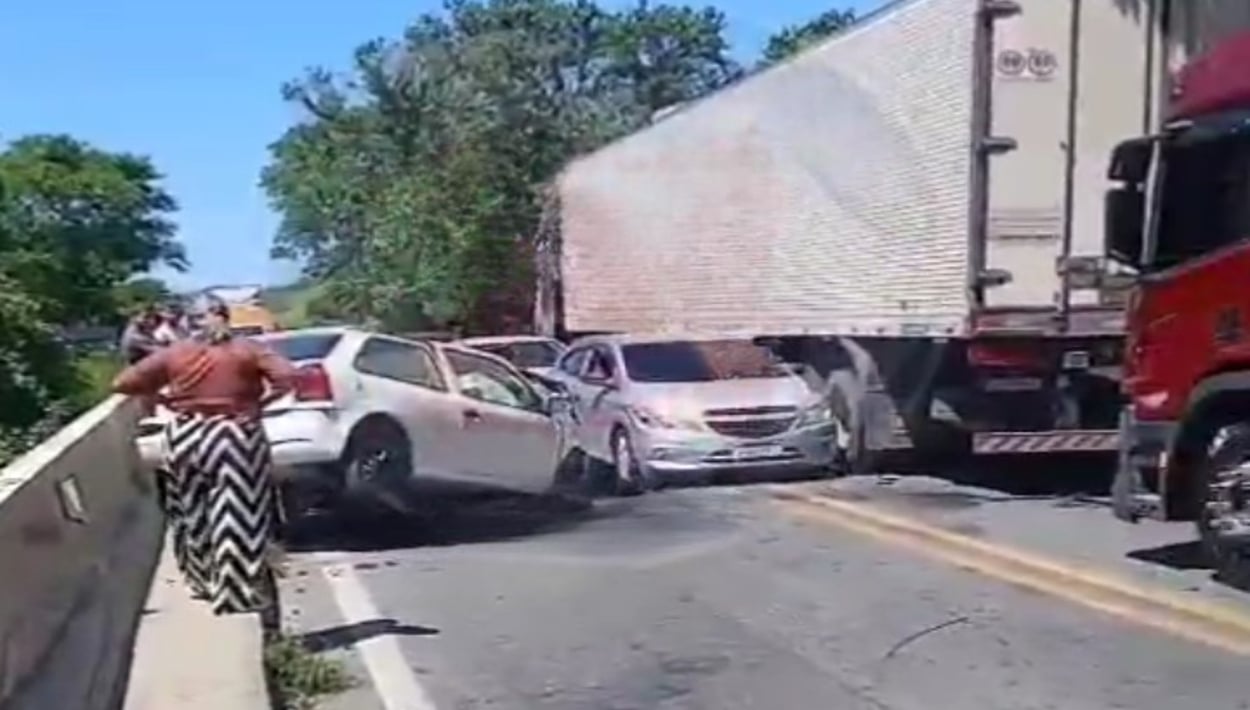Receba as principais notícias no seu WhatsApp! clique aquiImagens feitas por pessoas que passavam pelo local mostram os veículos destruídos após a colisão, com um dos carros ficando suspenso na mureta de proteção e outro prensado na lateral de um caminhão. A cena chamou a atenção de motoristas e moradores que acompanharam a movimentação.