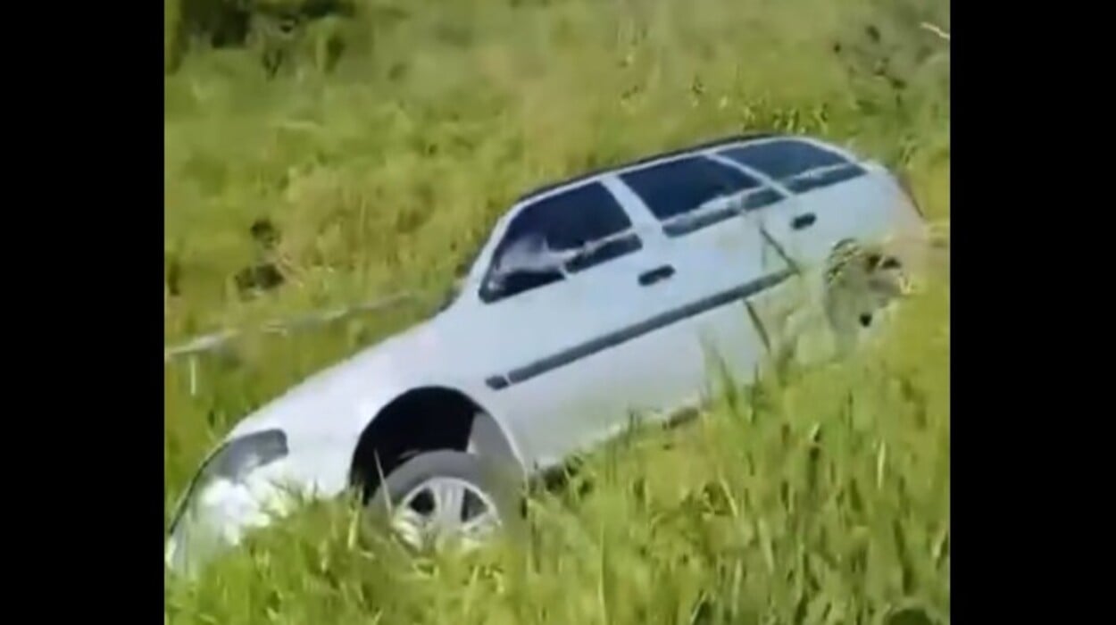 Um vídeo que circula nas redes sociais mostra um carro de cor prata parado em meio a uma área de mato alto. O veículo aparece inclinado, parcialmente encoberto pela vegetação, indicando que desceu um pequeno barranco após deixar a via.
