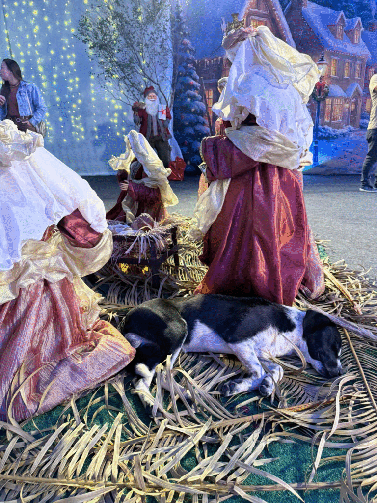 Cachorro vira atração ao deitar no presépio durante o Natal de Luz em Guaçuí