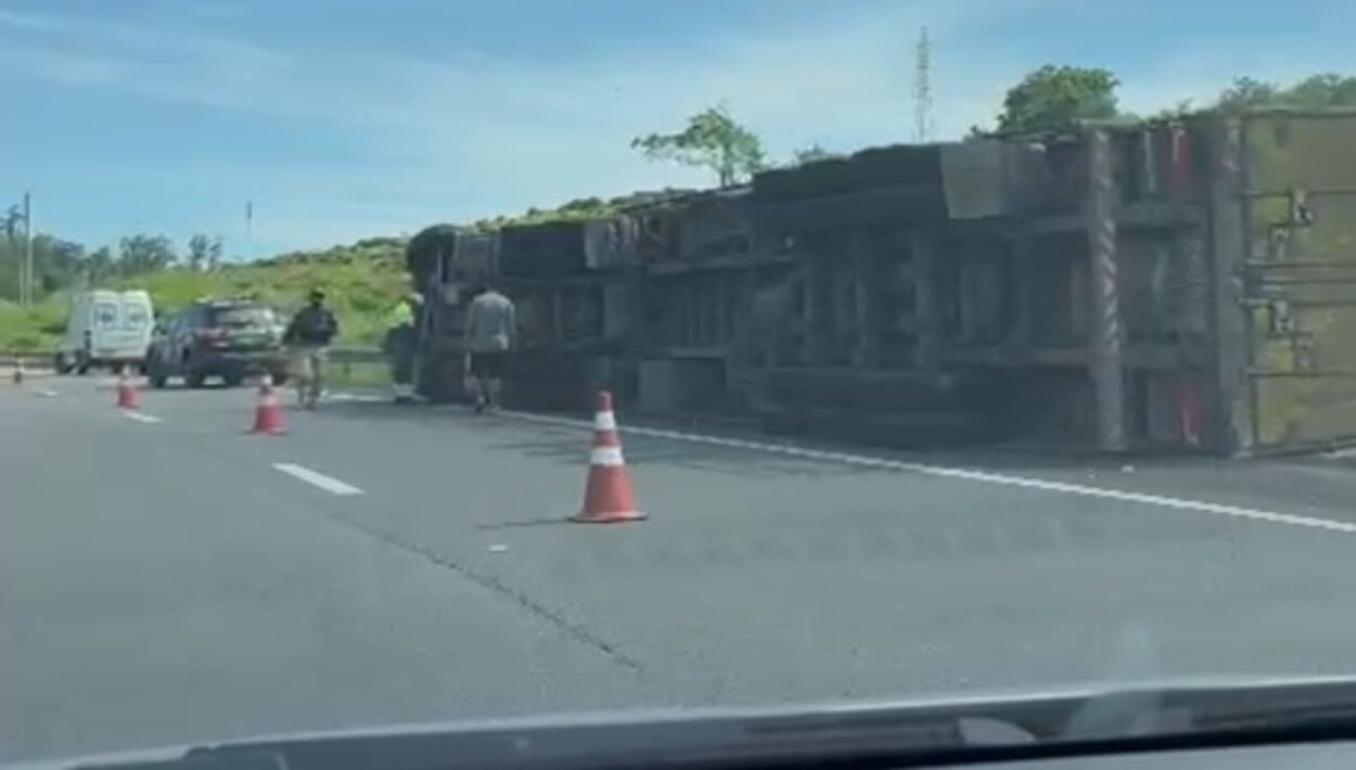 Receba as principais notícias no seu WhatsApp! clique aquiO acidente deixou parte da pista parcialmente interditada. Imagens registradas por um motorista que passava pelo local mostram o veículo completamente de lado, ocupando parte da faixa da direita. Também é possível observar uma ambulância no local.